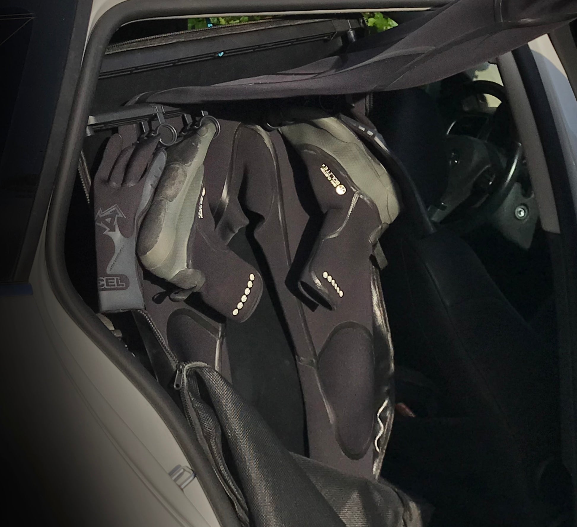 The creases that are created from a wadded up wetsuit damage the material and actually decrease the effectiveness of the wetsuit to keep you warm. The Azure Wetsuit System delicately hangs your wetsuit in the safest way to protect the materials. The surrounding bag protects your suit from damaging UV rays and random scuffs, all while protecting the interior of your vehicle from your saturated wetsuit.
